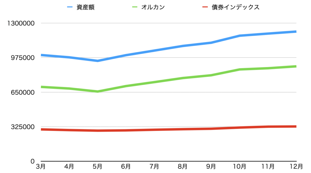 | 月 | 総資産額 | オルカン | 債券インデックス | ドル円 |