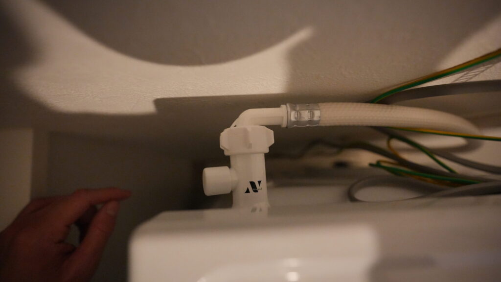 その狭いスペースに、後ろ向きに突き出した給水弁+ナノバブルアダプター+給水ホースが重なるため、壁に干渉するかどうかのギリギリの戦いになった。